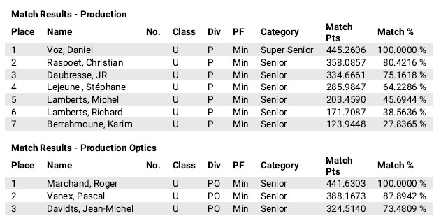 N.B. Le classement combiné est établi en additionnant les places de chaque tireur dans les disciplines pistolet et carabine correspondantes (classement point-place en ordre croissant).
